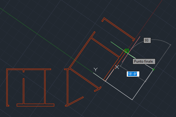 Lungo l'asse X dell'UCS, si può notare che il cursore e le linee della griglia vengono ruotate per essere parallele con il muro.