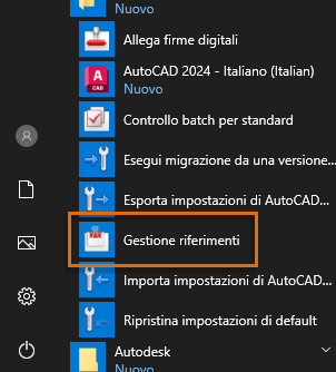 È possibile avviare Gestione riferimenti dal menu Start di Windows facendo clic su Autodesk > AutoCAD release > Gestione riferimenti.