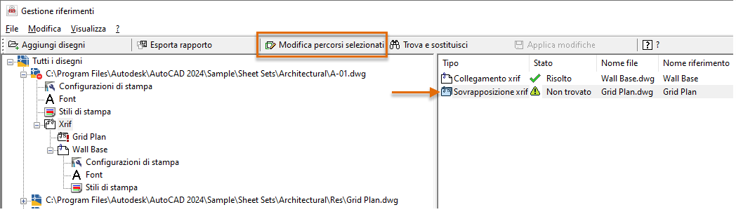 Nota: L'aggiornamento dei percorsi dei riferimenti con Gestione riferimenti potrebbe comportare il salvataggio dei file di disegno in un formato diverso rispetto all'ultimo salvataggio.
