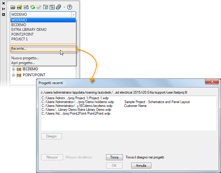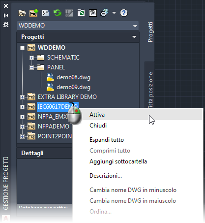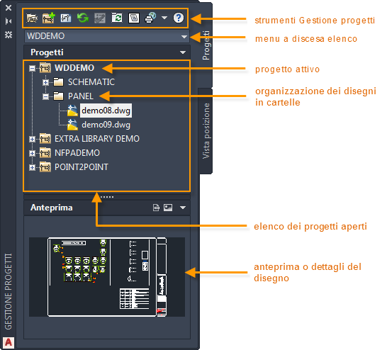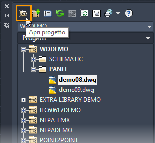 AutoCAD Electrical toolset è basato sui progetti. Per progetto si intende un gruppo di disegni correlati. Tutte le informazioni relative ad un progetto, inclusi i disegni contenuti nel progetto, vengono salvate in un file di progetto con estensione .wdp.