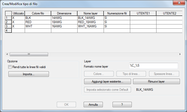 Per creare un layer di fili, immettere un colore e una dimensione per il filo nella riga vuota. Il nome del layer di default che viene immesso può essere modificato all'occorrenza. Durante un'operazione con i numeri dei fili, i numeri dei fili vengono aggiunti a tutti i layer a meno che la numerazione dei fili non sia disattivata per tali layer. Questa opzione è utile in alcuni casi, ad esempio per i disegni unifilari. Utilizzare Colore, Tipo di linea e Spessore linea per definire le proprietà del layer.