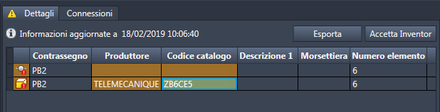Se i dati di catalogo sono aggiornati, fare clic su Sì per aggiornare tutti i valori associati quali PROD, macrocodice, codice catalogo, rating, elenco pin, numero dell'elemento, layout componente del quadro e descrizione del componente selezionato.