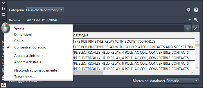 AutoCAD Electrical toolset utilizza le tavolozze per la gestione dei progetti e l'utilizzo del database del catalogo. Una tavolozza può rimanere aperta sullo schermo mentre sono in uso altri comandi. È pertanto accessibile in qualsiasi momento.