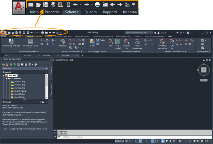 Dalla barra multifunzione è possibile accedere a tutte le funzionalità indicate in questa Guida. Inoltre, la barra degli strumenti Accesso rapido visualizzata include alcuni comandi di navigazione utilizzati in AutoCAD Electrical toolset.