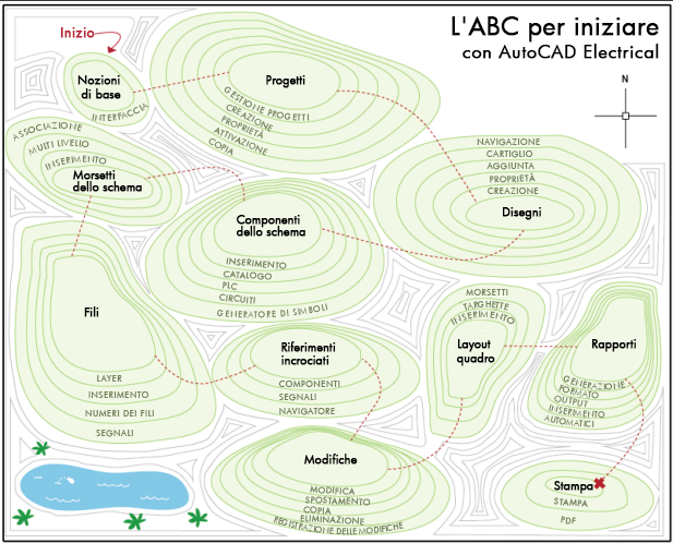 Questa guida è un ottimo punto di partenza per iniziare a lavorare con AutoCAD Electrical toolset. Come si può osservare nell'illustrazione, le caratteristiche sono state raggruppate per tipi di attività. Inoltre, i gruppi sono disposti in sequenza in modo da seguire un flusso di lavoro generico.