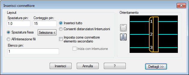 Lo strumento Inserisci connettore crea un simbolo di connettore in base ai parametri definiti dall'utente. Il simbolo viene creato all'istante e inserito come inserimento di blocco nel file di disegno attivo. Dal momento che i simboli vengono creati quando sono necessari, viene meno l'esigenza di creare e gestire una libreria di simboli di connettore.
