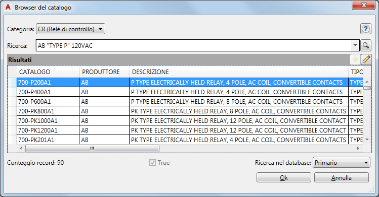 Il codice di catalogo e il codice produttore selezionati vengono visualizzati nella finestra di dialogo Inserisci/Modifica componente. Quando si fa clic su questa finestra di dialogo, i valori vengono trasferiti al simbolo.