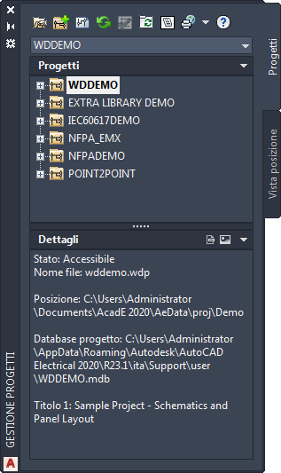 AutoCAD Electrical toolset è un sistema basato su progetti. Un testo ASCII con estensione .wdp definisce ciascun progetto. Questo file contiene un elenco di informazioni sul progetto, impostazioni di default del progetto, proprietà dei disegni e nomi dei file di disegno. È possibile disporre di un numero illimitato di progetti ma può essere attivo un solo progetto alla volta.
