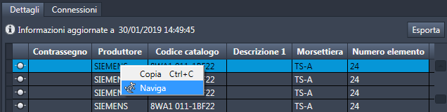 Per navigare su un numero di filo, fare clic su Visualizza dettagli e connessioni , quindi sulla scheda Connessioni. Selezionare una riga o un gruppo di righe, fare clic con il pulsante destro del mouse e selezionare Naviga.
