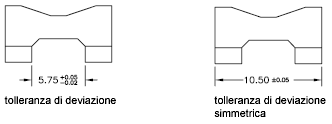 Se il valore della quota può variare in entrambe le direzioni, i valori positivi e negativi specificati vengono aggiunti al valore della quota come tolleranze di deviazione. Se i valori delle tolleranze di deviazione sono uguali, vengono visualizzati con il segno ± e sono definiti simmetrici. In caso contrario, il valore positivo viene posizionato al di sopra del valore negativo.