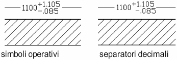 Unitamente al posizionamento verticale dei valori di tolleranza, è inoltre possibile controllare l'allineamento orizzontale dei valori di tolleranza superiori e inferiori. I valori di tolleranza superiore e inferiore possono essere allineati utilizzando i simboli operativi o i separatori decimali.