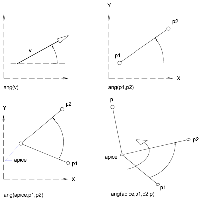 La funzione ang determina l'angolo tra due linee. Gli angoli vengono misurati in senso antiorario rispetto all'asse X nel caso di un disegno 2D oppure rispetto ad un asse specificato dall'utente nel caso di un modello 3D.