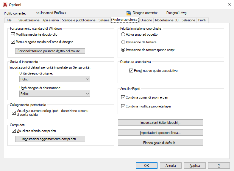 Controlla la scala di default per l'inserimento di blocchi e disegni in un disegno.