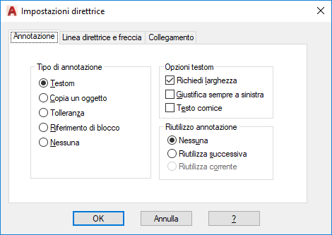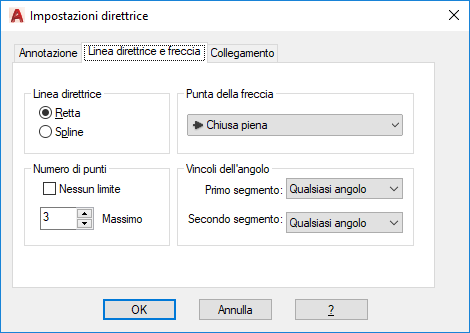 Nella finestra di dialogo Impostazioni direttrice sono incluse le seguenti schede: Annotazione, Linea direttrice e freccia e Collegamento