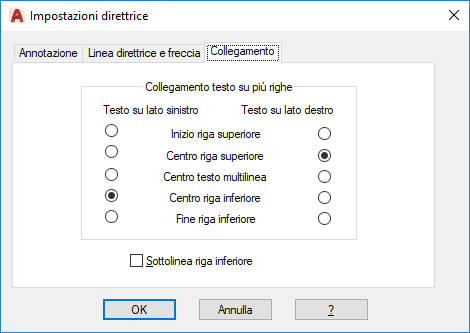 Consente di impostare la posizione in cui le direttrici vengono attaccate alle annotazioni di testo multilinea. Questa scheda è disponibile solo se è stato selezionato testoM nella scheda Collegamento.