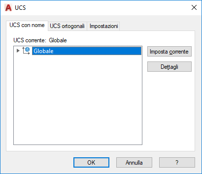 Elenca, rinomina e ripristina le definizioni UCS precedenti; controlla inoltre le impostazioni dell'UCS e della relativa icona per le finestre.
