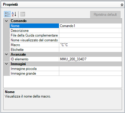 - Nella casella Nome, digitare un nome per il comando. Il valore è utilizzato come nome di default quando viene aggiunto ad un elemento dell'interfaccia utente e all'interno di una descrizione comandi.