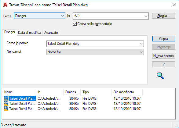 Specifica il nome del disegno, del blocco, del layer, dell'xrif o di un altro tipo di contenuto di cui si desidera effettuare la ricerca.