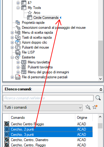 Nel riquadro Elenco comandi, trascinare il comando da aggiungere al sottomenu della barra degli strumenti nel riquadro Personalizzazioni in <nome file>.