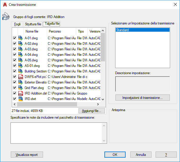 Per default, vengono elencati tutti i file associati al disegno corrente (quali rimandi, stili di stampa e font correlati). È possibile aggiungere altri file al pacchetto di trasmissione o rimuovere quelli esistenti. I file correlati a cui viene fatto riferimento tramite URL non vengono inclusi nel pacchetto di trasmissione.