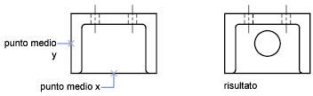 Il foro nella piastra di supporto dell'illustrazione seguente è stato centrato nel rettangolo estraendo le coordinate X,Y dai punti medi dei segmenti di linea orizzontali e verticali della piastra.