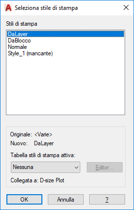 Imposta la tabella stili di stampa assegnata al disegno corrente. Una tabella stili di stampa contiene le definizioni degli stili.