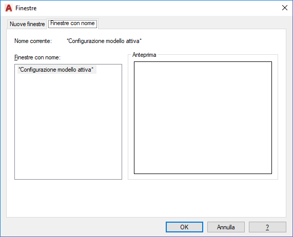 Consente di visualizzare tutte le configurazioni di finestre dello spazio modello salvate con nome in modo da poterle utilizzare nel layout corrente. Non è possibile salvare con nome una configurazione di finestre di layout.