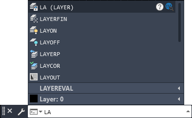 Per default, il nome del comando o della variabile di sistema viene completato automaticamente durante la digitazione. Viene visualizzato anche un elenco di suggerimenti per comandi e variabili di sistema che utilizzano le stesse lettere. È possibile controllare le impostazioni di queste funzionalità nella finestra di dialogo Opzioni di ricerca input.