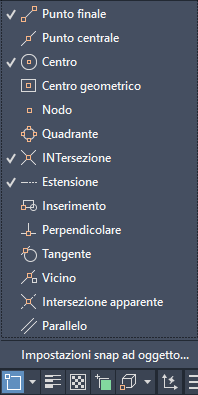 Sulla barra di stato, fare clic sulla freccia rivolta verso il basso accanto al pulsante Snap ad oggetto e scegliere Impostazioni snap ad oggetto.