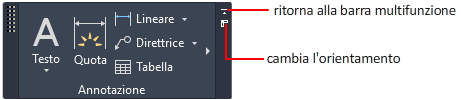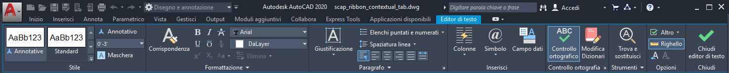 Quando si seleziona un particolare tipo di oggetto o si avviano determinati comandi, viene visualizzata una scheda contestuale della barra multifunzione anziché una barra degli strumenti o una finestra di dialogo. La scheda contestuale viene chiusa al termine del comando.