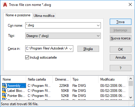 Poiché il tipo di file da includere nella ricerca viene definito dal Tipo, non è necessario digitare l'estensione del file nella casella Con nome. Ad esempio, per cercare casa102.dwg, digitare casa* e impostare il Tipo su Disegno (*.dwg).