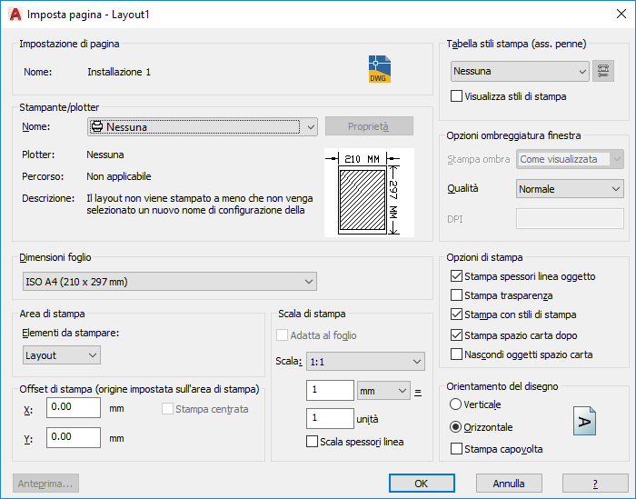 Le impostazioni di impostazione pagina specificate dall'utente vengono memorizzate con il layout e possono essere applicate ad altri layout o importate in altri disegni.
