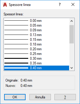 Visualizza lo spessore linea disponibile da applicare. Gli spessori di linea disponibili sono quelli che vengono più comunemente utilizzati nei disegni. Per applicare uno spessore di linea, è necessario selezionarlo.