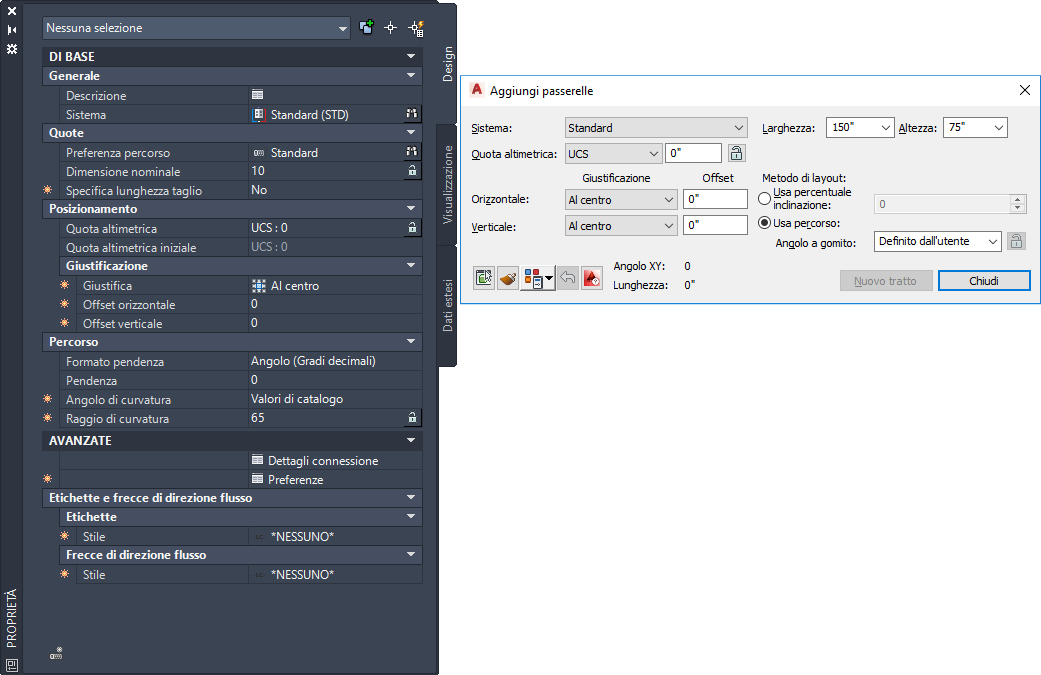 Gli strumenti Passerella e Tubo protettivo presentano sistemi specifici e predefiniti quali Alimentazione - 120 V o Dati. La passerella o il tubo protettivo che si disegna eredita le proprietà del sistema come i rispettivi parametri di design, le proprietà di visualizzazione e lo stile di salita e discesa.
