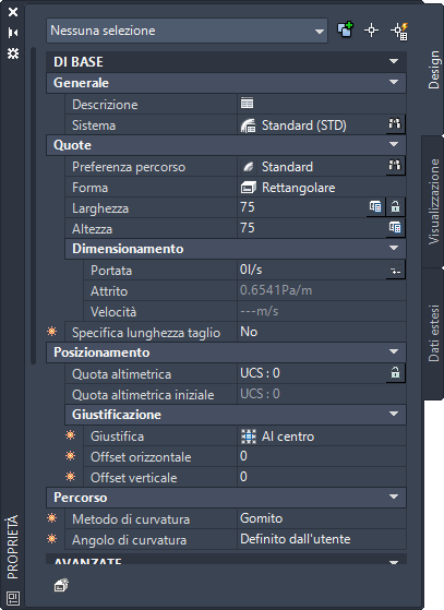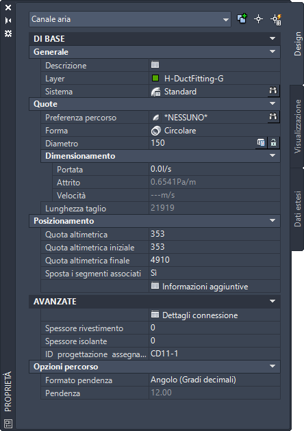 Il riquadro proprietà mostra un valore accanto al campo Velocità, ad indicare che la dimensione del canale aria è stata calcolata utilizzando il metodo di velocità costante.