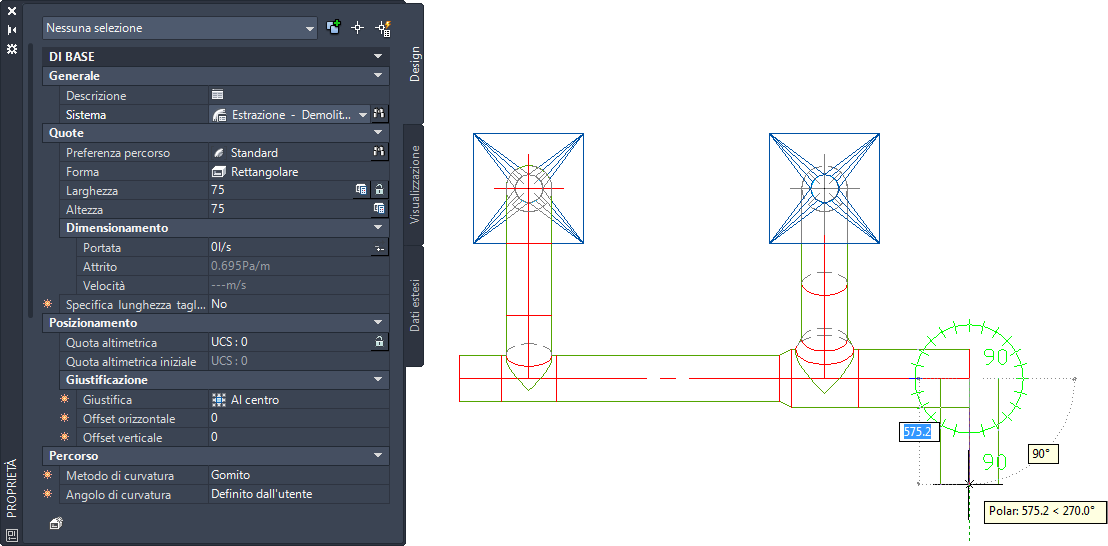 Se vengono assegnati valori di flusso all'attrezzatura di emissione, è possibile utilizzare lo strumento di dimensionamento dinamico per calcolare le dimensioni della rete di canali aria nella fase di disegno dei tratti di canale aria. È inoltre possibile utilizzare lo strumento di dimensionamento dinamico per la modifica di tratti di canale aria esistenti.
