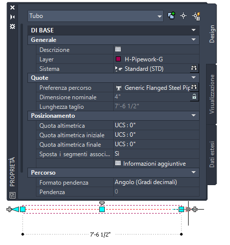 La lunghezza di un segmento di tubo viene modellata in modo accurato mediante giunti separati. Nel riquadro proprietà, la lunghezza di taglio è la lunghezza effettiva del tubo e include i valori di profondità necessari per la connessione delle flange.