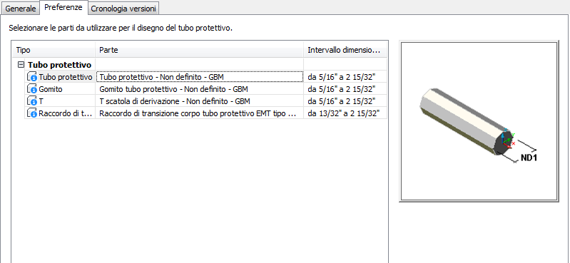 La preferenza di percorso di un tubo protettivo include uno o più tipi di connessione (ad esempio una vite di fermo) nelle dimensioni parte disponibili per tubi protettivi e raccordi. Sulla destra della finestra di dialogo viene visualizzata un'anteprima della parte selezionata. L'immagine a destra fornisce una rappresentazione grafica della parte selezionata.