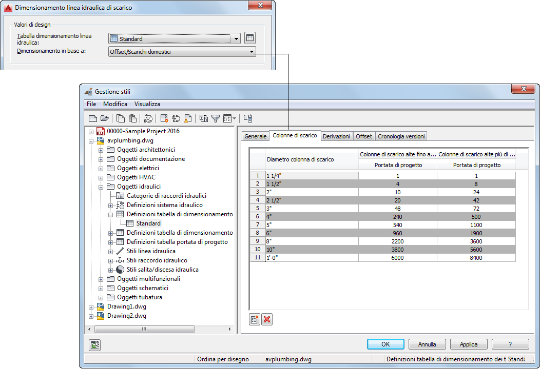 Quando si definisce il tratto di linea di scarico come colonna di scarico alta fino a tre piani o più di tre piani, i calcoli di dimensionamento vengono eseguiti in base ai dati della scheda Colonne di scarico della tabella di dimensionamento della linea idraulica di scarico (tabella di dimensionamento tubo), le cui definizioni si trovano in Gestione stili.