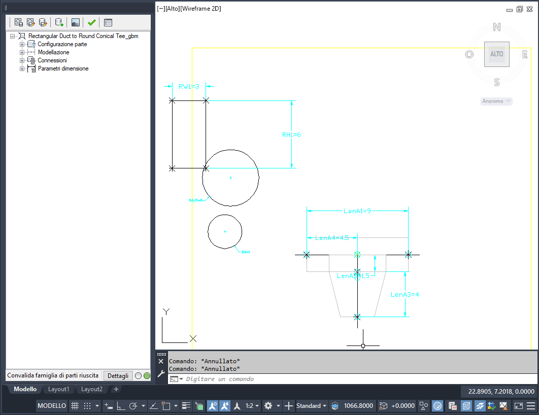 Quando si sceglie di creare o modificare una parte parametrica, nel Generatore di contenuti viene utilizzato l'ambiente di costruzione parametrico. Nel seguente esempio il Generatore di contenuti visualizza un T ad innesto conico per canale aria da rettangolare a circolare. Per ulteriori informazioni, vedere Avvio del Generatore di contenuti.