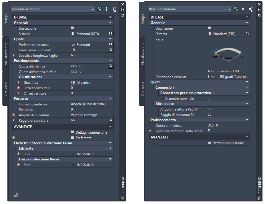 .Per specificare le impostazioni di tubi protettivi e raccordi, è possibile utilizzare il riquadro proprietà per i tubi protettivi.