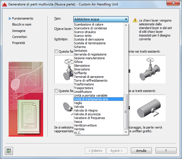 Il tipo di parte fa riferimento alla categoria principale della famiglia di parti e definisce caratteristiche e funzionamento univoci per le dimensioni parte, ad esempio la capacità di assegnare un'annotazione di flusso ad una dimensione parte HVAC. I tipi sono predefiniti nell'applicazione e non possono essere modificati, pertanto è necessario selezionare un tipo simile alle dimensioni parte.