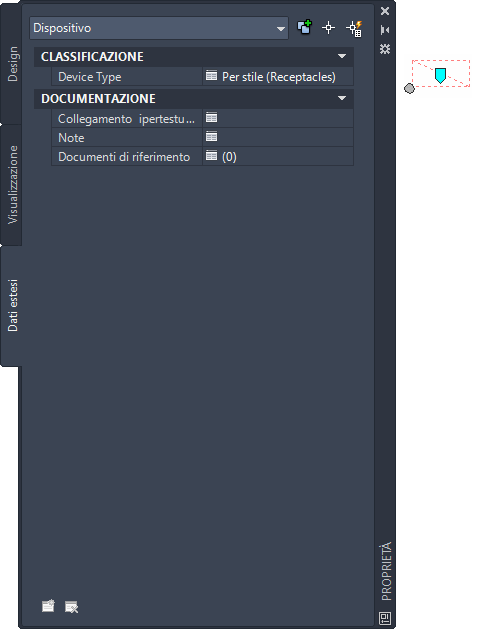 I dispositivi nei disegni rappresentano istanze di uno stile di dispositivo; per i dispositivi è pertanto specificata una proprietà per ciascuna definizione classificazioni nello stile del dispositivo. Nella scheda Dati estesi del riquadro proprietà, è possibile visualizzare o sostituire la classificazione di uno o più dispositivi presenti nel disegno.