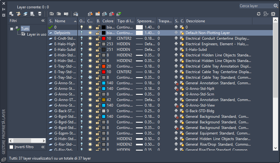 Gestore proprietà layer consente di visualizzare e gestire i layer nel disegno corrente.