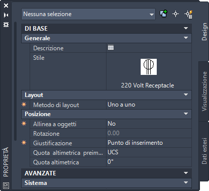 Sebbene sia possibile creare e configurare strumenti oggetto per altri sistemi dell'edificio tramite la programmazione AutoLISP, le proprietà oggetto possono essere impostate direttamente nel riquadro proprietà dello strumento come illustrato di seguito solo tramite gli strumenti per gli oggetti menzionati in precedenza.