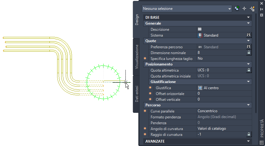 Nel riquadro proprietà sono disponibili due opzioni per la configurazione di curve parallele: Concentrico e Raggio fisso. Tali opzioni consentono di specificare il tipo di raggio di curvatura da utilizzare in un tratto di tubi protettivi paralleli.