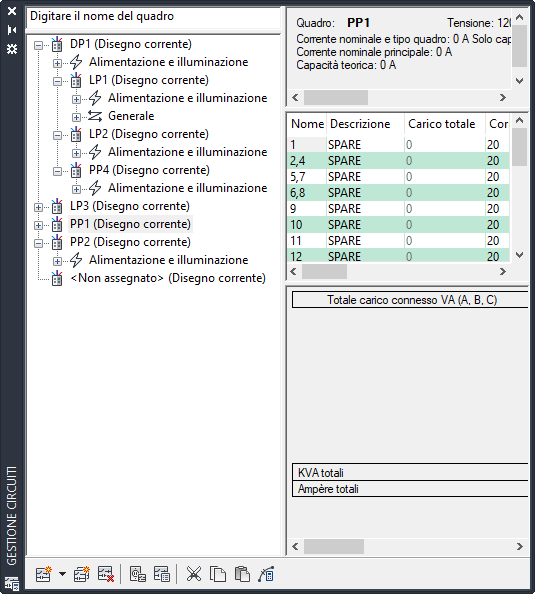 Dopo aver collegato i quadri, utilizzare Gestione circuiti per trasferire la richiesta di carico del quadro e i carichi totali connessi per ogni categoria di carico da un quadro ad un altro.