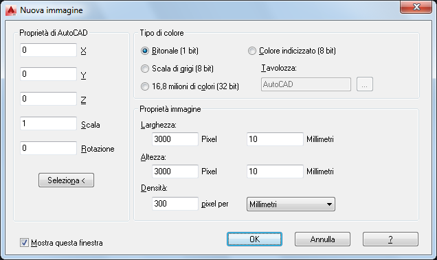 Dopo aver creato la nuova immagine, è necessario salvarla per stabilire un collegamento tra il disegno e il file di immagine. Per definire le proprietà di più immagini nuove, utilizzare la scheda Nuova immagine nella finestra di dialogo Opzioni di AutoCAD Raster Design.