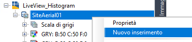 | 6 | Per provare ad usare altri controlli dell'istogramma per modificare l'immagine, inserire altre copie dell'immagine. Per eseguire questa operazione, accertarsi che la funzione Gestione immagini sia attiva (se necessario, fare clic sul menu Raster Gestione). Nella vista Dati immagine, fare clic con il pulsante destro del mouse sul nome dell'immagine e scegliere Nuovo inserimento.