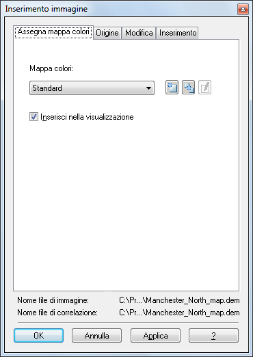 È possibile utilizzare la finestra di dialogo Inserimento immagine per assegnare una banda di dati a ciascun canale di colore e stabilire quali canali includere nella visualizzazione. In qualunque momento è possibile modificare l'assegnazione di banda e visualizzare i risultati sullo schermo.